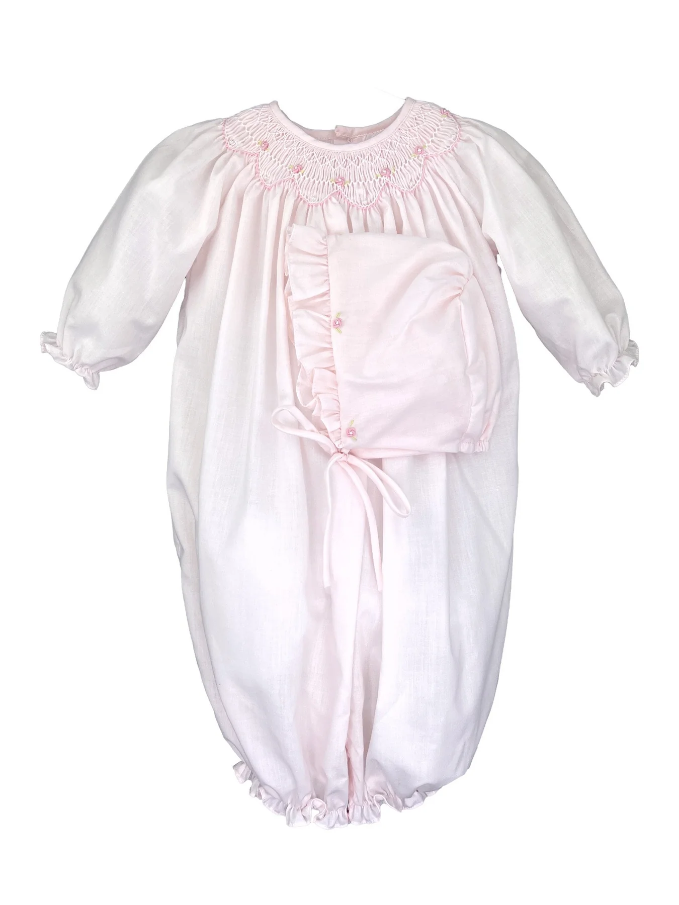 Petit Ami- Pink Rose Smocked Gown & Hat Set