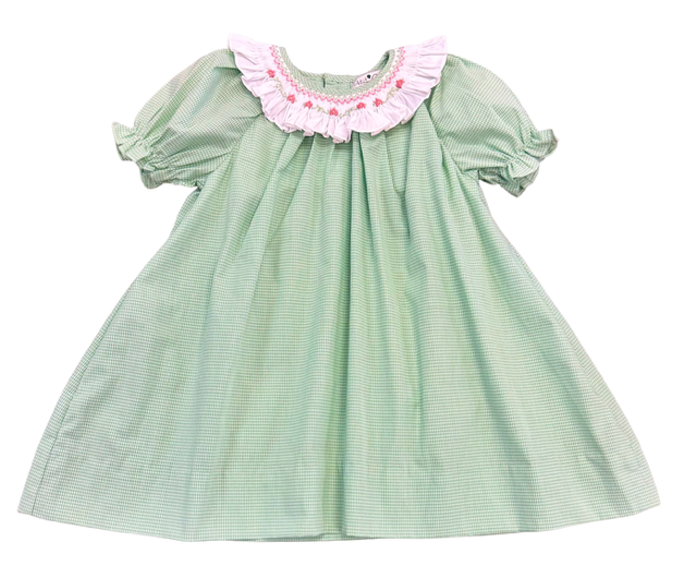 Petit Ami- Green Check Dress w Pink Floral Ruffle Collar