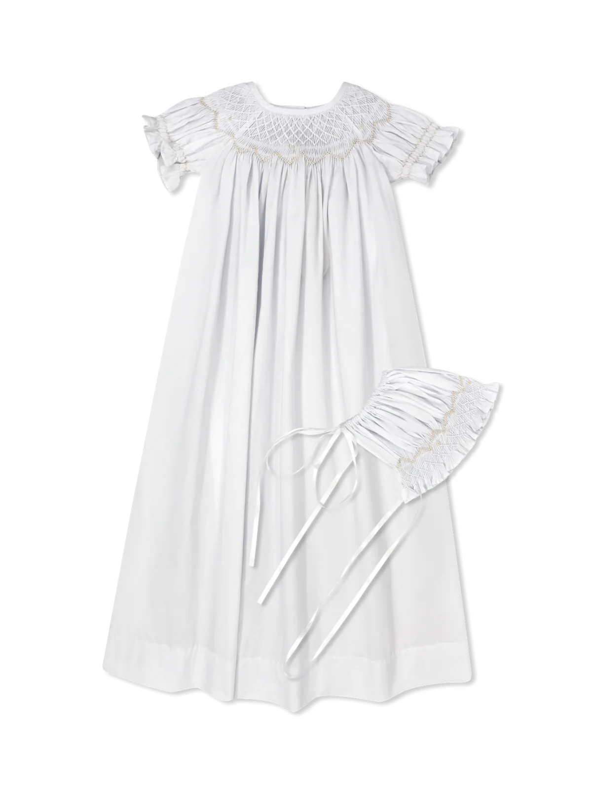 Lullaby Set- White Rosebud Smocked Daygown Set w Rosebud Cross Embellishment