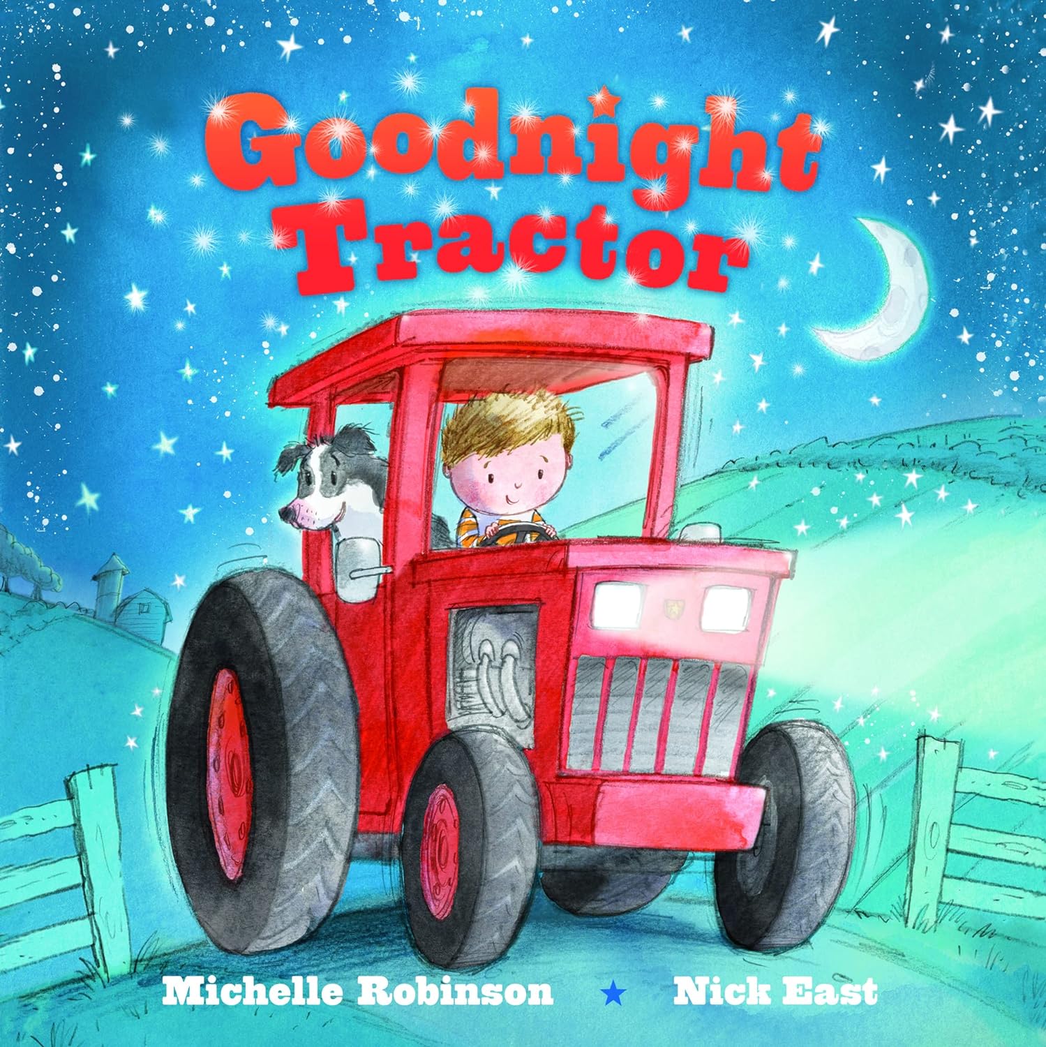 Goodnight farmer. Goodnight plow. Goodnight trailer. Goodnight cow. Goodnight dog, and goodnight sheep. Goodnight Tractor, time to sleep.